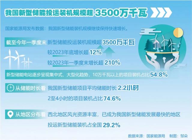 國家能源局發(fā)布數(shù)據(jù):我國新型儲(chǔ)能裝機(jī)規(guī)模繼續(xù)保持快速增長。截至今年一季度末,新型儲(chǔ)能投運(yùn)裝機(jī)規(guī)模超3500萬千瓦,較2023年底增長超12%,較2023年一季度末增長超210%。