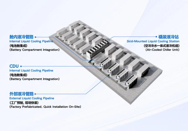 該系統(tǒng)由集中布置的液冷站、布置于電池艙內(nèi)的配水動(dòng)力站(CDU) 、電池艙內(nèi)外液冷管路,以及TMS智控系統(tǒng)組成,其具有空冷冷水一體式液冷機(jī)組和均衡智控 TMS 兩項(xiàng)節(jié)能關(guān)鍵技術(shù):首先是集中式液冷機(jī)組相比分布式液冷機(jī)組全年能效比提高113%,全年節(jié)省能耗大于50%。其次是均衡智控TMS基于負(fù)荷實(shí)時(shí)預(yù)測(cè)、CPC均衡模型等,可精準(zhǔn)預(yù)測(cè)電池系統(tǒng)溫控目標(biāo)曲線,實(shí)現(xiàn)電芯均衡冷卻,可使液冷系統(tǒng)冷卻能力輸出峰值降低35%以上,帶來(lái)液冷站配置規(guī)??蓽p小35%或節(jié)能45%,相比于分布式電池艙液冷系統(tǒng)節(jié)能效果顯著,在儲(chǔ)能液冷、數(shù)據(jù)中心液冷等領(lǐng)域都具備良好的應(yīng)用前景。