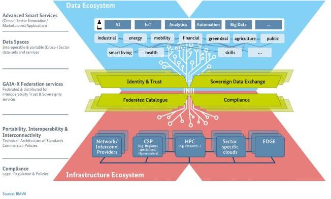 目前,德國和法國已成為眼下歐盟地區(qū)云計算項目的領導者,由兩國牽頭的Gaia-X 項目,便致力于建立一個真正屬于歐洲的數(shù)據(jù)基礎設施,即歐盟的“母云端”。這個項目的目標是實現(xiàn)數(shù)據(jù)的互操作性,從而促進數(shù)據(jù)的自由流動和共享。該項目對于歐洲的云計算發(fā)展有著重要的影響,將進一步促進了歐洲各國之間的云計算合作,推動了這個地區(qū)的云計算技術的發(fā)展。