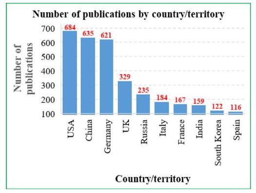 在理論研究方面,卡塔爾大學工程學院學者Ahmad K. Sleiti在2022年通過研究發(fā)現(xiàn),數(shù)字孿生技術在能源行業(yè)中的研究成果依舊集中在經(jīng)濟發(fā)達地區(qū),其中歐盟地區(qū)發(fā)表成果最多。據(jù)下列圖表顯示,歐盟地區(qū)(德國、意大利、法國、西班牙)研究成果整體數(shù)量高于美國、中國、英國以及俄羅斯國家等國家,占據(jù)全球第一位。