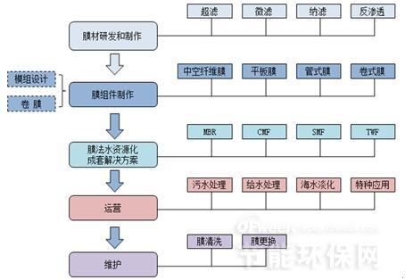 膜法水處理產(chǎn)業(yè)鏈由膜材料研發(fā)和制作、膜組件制作、膜法水資源化成套解決方案、運營和維護組成。其中膜法水資源化整體解決方案又涵蓋了工藝方案、投標、詳細設計、系統(tǒng)集成、施工安裝、系統(tǒng)試車、技術(shù)支持和售后服務等流程。其中,膜材料/膜元件制作和研發(fā)在整條產(chǎn)業(yè)鏈中擁有更高的技術(shù)先進性和盈利性。