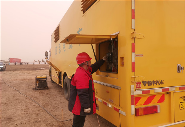 開工儀式當(dāng)天沙塵天氣持續(xù),揚(yáng)沙隨風(fēng)彌漫,突擊隊的保電人員不辭辛苦一大早便提前進(jìn)入會場。將發(fā)電車??吭谇捌诓榭钡闹付ㄎ恢?,做好安全監(jiān)護(hù)相關(guān)的工作之后,啟動車輛試運行,檢查了各項儀表數(shù)據(jù),并做好與用戶側(cè)供電設(shè)備的對接,全力以赴投入保電工作。該分局領(lǐng)導(dǎo)帶領(lǐng)保電人員全程守候在現(xiàn)場,隨時應(yīng)對突發(fā)停電事故的發(fā)生,確保了開工儀式用電萬無一失。