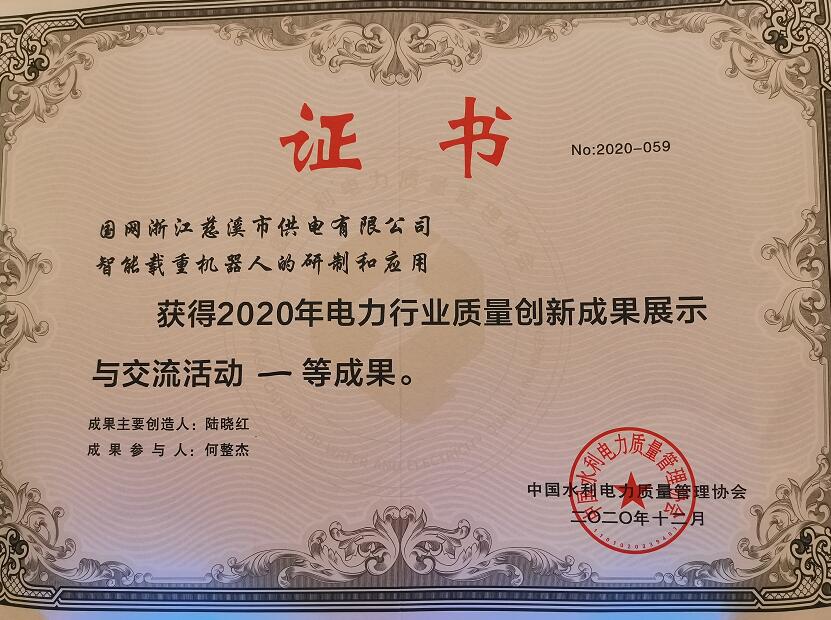 中國電力網(wǎng)訊 12月4日,2020年電力行業(yè)質(zhì)量創(chuàng)新成果展示與交流會在寧波圓滿結(jié)束,國網(wǎng)慈溪市供電公司質(zhì)量創(chuàng)新成果《智能載重機(jī)器人的研制和應(yīng)用》從全國80多項課題中脫穎而出,榮獲全國電力行業(yè)質(zhì)量創(chuàng)新成果一等獎。