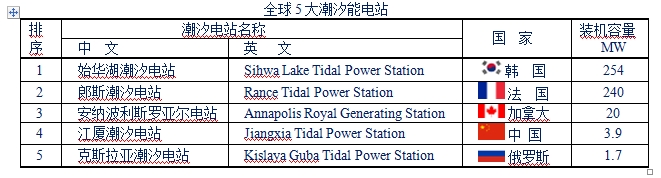 世界上最大的潮汐電站是韓國(guó)始華湖潮汐電站(Sihwa Lake Tidal Power Station),裝機(jī)容量為254MW。中國(guó)最大的潮汐電站是江廈潮汐電站(Jiangxia Tidal Power Station ),裝機(jī)容量?jī)H為3.9MW。