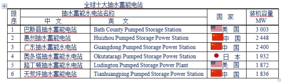 世界上第一座抽水蓄能電站是瑞士于1879年建成的勒頓抽水蓄能電站。當(dāng)今世界上最大的抽水蓄能電站是美國(guó)巴斯康蒂抽水蓄能電站,裝機(jī)容量達(dá)3003MW,其次為中國(guó)惠州抽水蓄能電站,裝機(jī)容量為2448 MW,廣東抽水蓄能水電站(Guangdong Pumped Storage Power Station),裝機(jī)容量為2400MW。