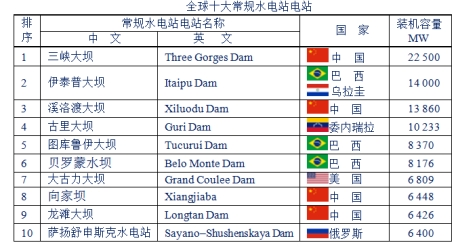 中國(guó)湖北省的三峽水電站仍然是世界上最大的水電站,總裝機(jī)容量為22.50 GW;位于巴西和巴拉圭的伊泰普水電站是世界第二大水電站,裝機(jī)容量為14.00 GW。不過(guò),伊泰普水電站所處的巴拉那河水量豐沛且季節(jié)分布相對(duì)均衡,幾乎可以全年滿負(fù)荷發(fā)電;而三峽水電站則每年都會(huì)經(jīng)歷約6個(gè)月的枯水期,從而限制了其發(fā)電量。