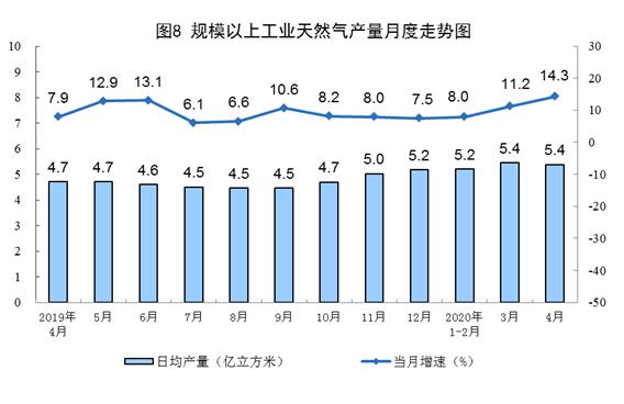 天然氣生產(chǎn)加快。4月份,生產(chǎn)天然氣161億立方米,同比增長14.3%,增速比上月加快3.1個百分點,日均產(chǎn)量5.4億立方米。1—4月份,生產(chǎn)天然氣644億立方米,同比增長10.3%。
