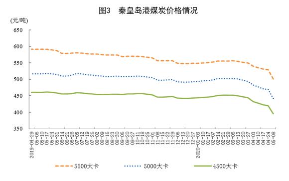 煤炭進口增長較快,交易價格有所下跌。4月份,進口煤炭3095萬噸,同比增長22.3%;1—4月份,進口煤炭1.3億噸,同比增長26.9%。港口煤炭綜合交易價格繼續(xù)下跌,5月8日秦皇島港5500、5000和4500大卡煤炭價格分別為每噸501元、442元和396元,比4月3日分別下跌39元、41元和36元。