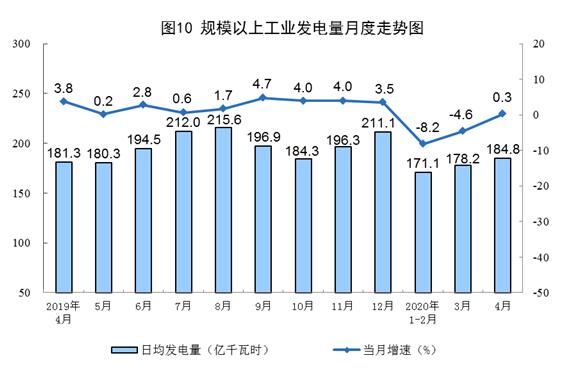 電力生產(chǎn)由降轉(zhuǎn)增。4月份,發(fā)電量5543億千瓦時,同比增長0.3%,上月為下降4.6%,日均發(fā)電量184.8億千瓦時,環(huán)比增加6.6億千瓦時。1—4月份,發(fā)電量21388億千瓦時,同比下降5.0%。
