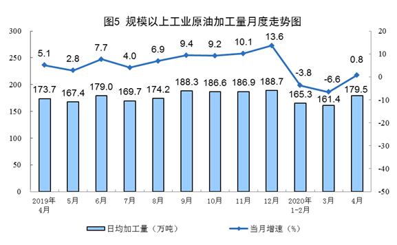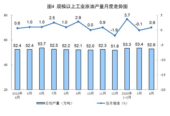 原油生產(chǎn)平穩(wěn),加工量由降轉(zhuǎn)增。4月份,生產(chǎn)原油1587萬噸,同比增長0.9%,增速由負轉(zhuǎn)正,上月為下降0.1%,日均產(chǎn)量52.9萬噸;加工原油5385萬噸,同比增長0.8%,上月為下降6.6%,日均加工179.5萬噸。1—4月份,生產(chǎn)原油6444萬噸,同比增長2.0%;加工原油20348萬噸,同比下降3.4%。