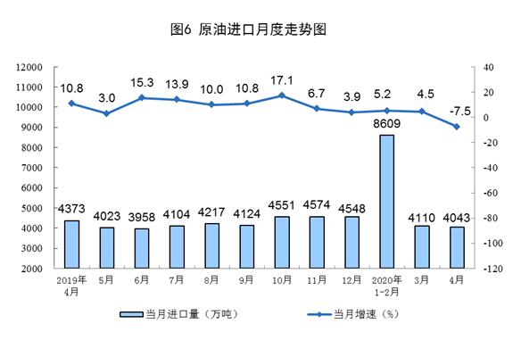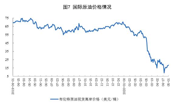 原油進口下降,國際原油價格低位震蕩。4月份,進口原油4043萬噸,同比下降7.5%。1—4月份,進口原油16761萬噸,同比增長1.7%。4月30日布倫特原油現(xiàn)貨離岸價格為18.11美元/桶,比3月31日的14.85美元/桶上漲22.0%。