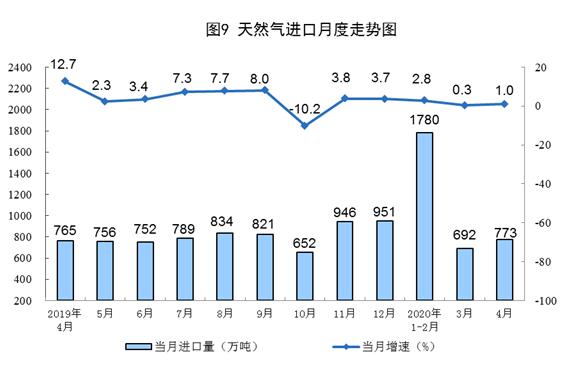 天然氣進口小幅增長。4月份,進口天然氣773萬噸,同比增長1.0%。1—4月份,進口天然氣3233萬噸,同比增長1.5%。