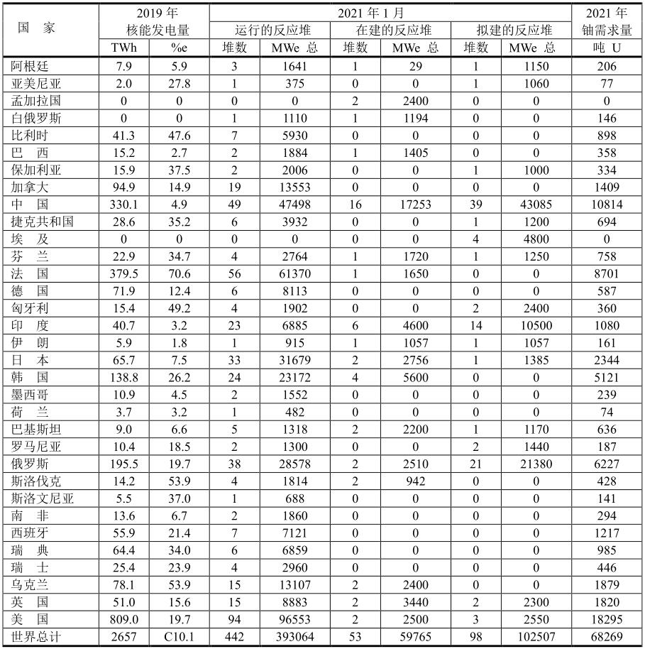 表中“%e”表示核能發(fā)電占發(fā)電總量的百分率。全球核能發(fā)電占全球發(fā)電總量的10.1%,其中法國高達(dá)70.6%。本數(shù)據(jù)是世界核能協(xié)會(huì)WNA 2021年1月份提供的數(shù)據(jù)。