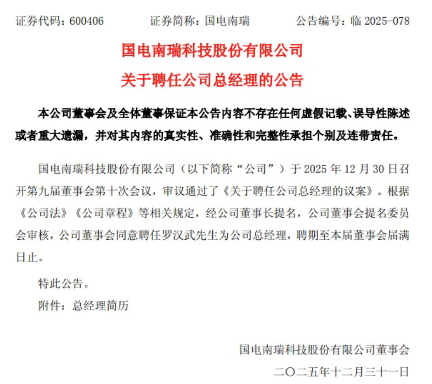 12月31日,國電南瑞發(fā)布公告,國電南瑞科技股份有限公司于2025年12月30日召開第九屆董事會第十次會議,審議通過了《關(guān)于聘任公司總經(jīng)理的議案》。根據(jù)《公司法》《公司章程》等相關(guān)規(guī)定,經(jīng)公司董事長提名,公司董事會提名委員會審核,公司董事會同意聘任羅漢武先生為公司總經(jīng)理,聘期至本屆董事會屆滿日止。