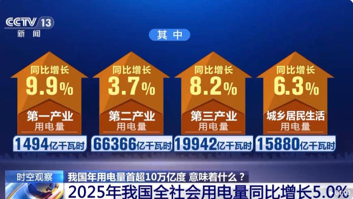 超10萬億度的年用電量,也考驗著一個國家電力系統(tǒng)的供給能力與韌性。2025年,我國通過構(gòu)建清潔低碳的發(fā)電體系、打造高效互聯(lián)的輸電網(wǎng)絡(luò)、完善靈活智能的調(diào)度機制,實現(xiàn)了電力的穩(wěn)定可靠供給。10萬億度電究竟用在了哪里?