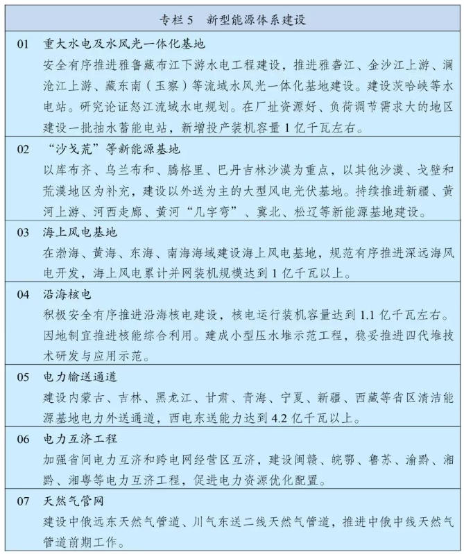 同時(shí),《綱要》提出要加力建設(shè)新型能源基礎(chǔ)設(shè)施,深入實(shí)施能源安全新戰(zhàn)略,加快構(gòu)建清潔低碳安全高效的新型能源體系,建設(shè)能源強(qiáng)國(guó)。推進(jìn)非化石能源安全可靠有序替代化石能源,堅(jiān)持風(fēng)光水核等多能并舉,實(shí)施非化石能源十年倍增行動(dòng)。統(tǒng)籌就地消納和外送,建設(shè)“三北”風(fēng)電光伏、西南水風(fēng)光一體化、沿海核電、海上風(fēng)電等清潔能源基地,加強(qiáng)分布式能源就近開(kāi)發(fā)利用,布局發(fā)展綠色氫氨醇,積極推進(jìn)光熱發(fā)電和地?zé)崮芾?。加?qiáng)化石能源清潔高效利用,推進(jìn)煤電改造升級(jí)和散煤替代。著力構(gòu)建新型電力系統(tǒng),全面提升電力系統(tǒng)互補(bǔ)互濟(jì)和安全韌性水平,優(yōu)化全國(guó)電力流向和跨區(qū)域通道布局,加快智能電網(wǎng)建設(shè),完善城鄉(xiāng)配電網(wǎng),科學(xué)布局抽水蓄能,大力發(fā)展新型儲(chǔ)能。提高終端用能電氣化水平,推動(dòng)能源消費(fèi)綠色化低碳化。基本建成全國(guó)統(tǒng)一電力市場(chǎng)體系,完善油氣“全國(guó)一張網(wǎng)”運(yùn)行調(diào)度機(jī)制。
